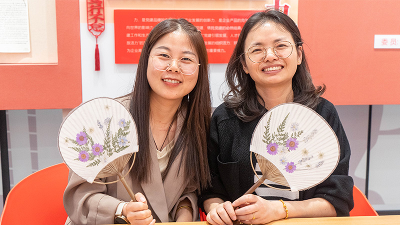 在老师的指导下,员工们纷纷动手,将一朵朵精心挑选的鲜花押在团扇上。大家一边制作团扇,用双手传递着对母亲的深情厚意,一边交流心得,体验着传统手工艺的乐趣。